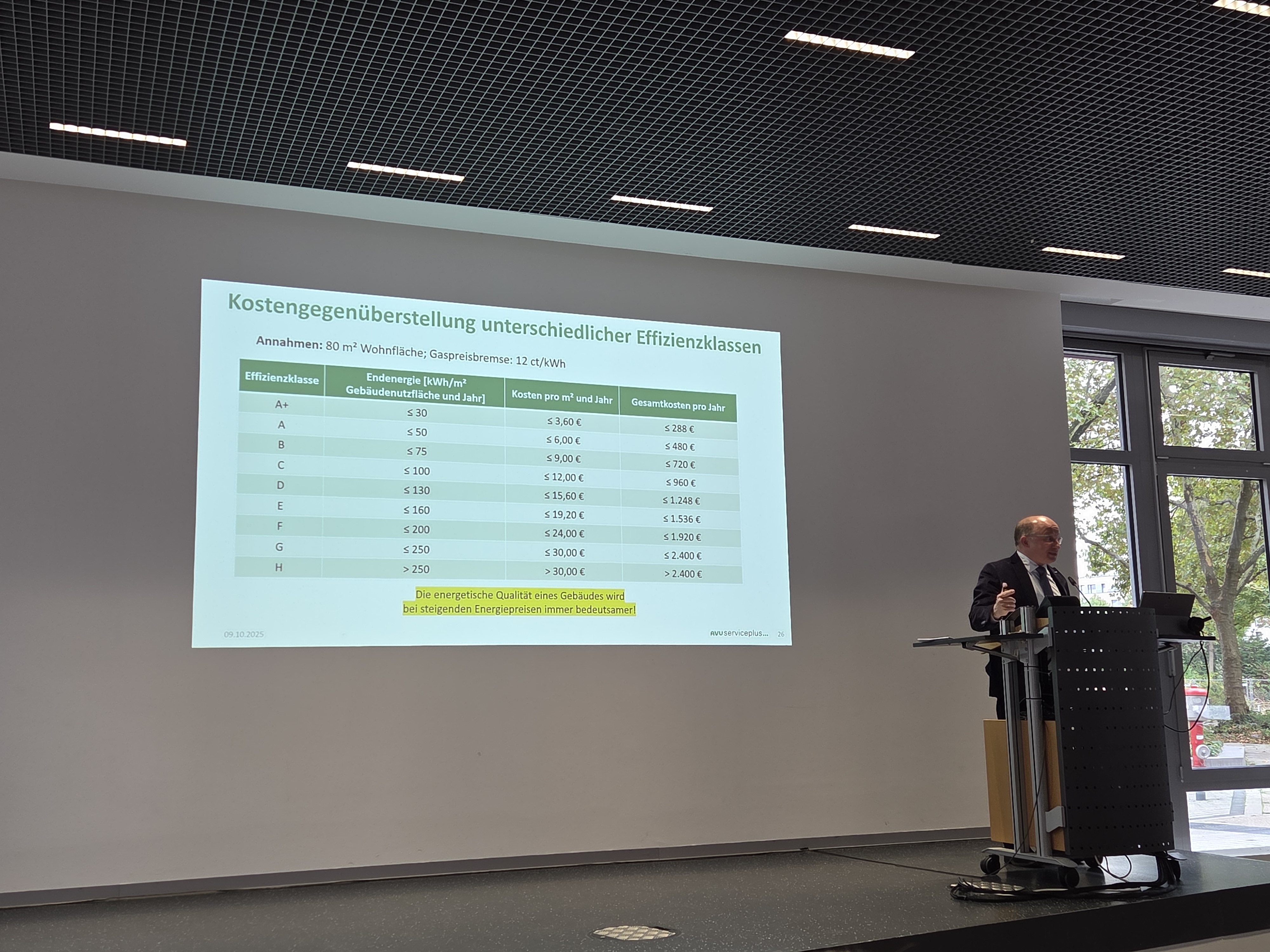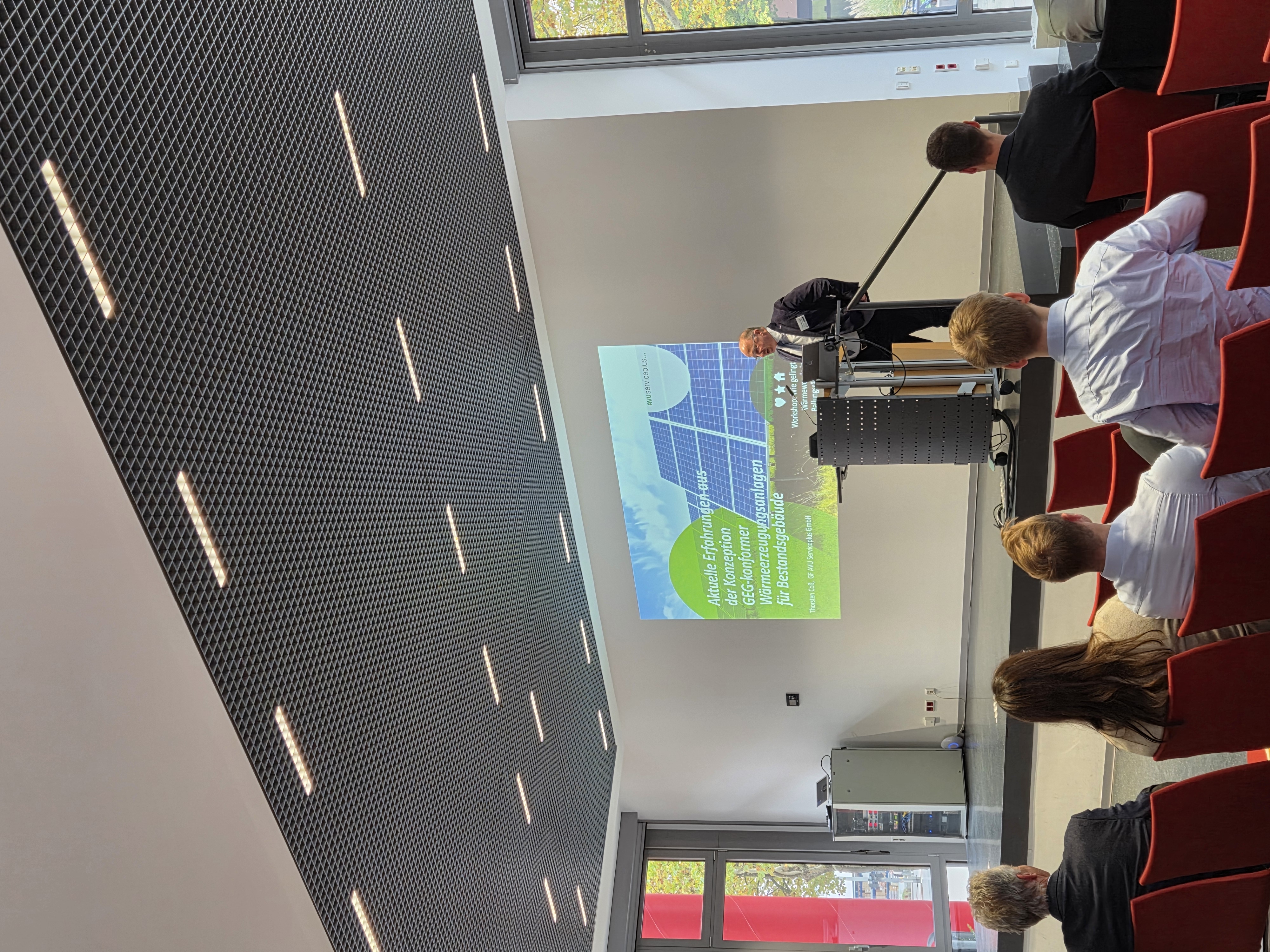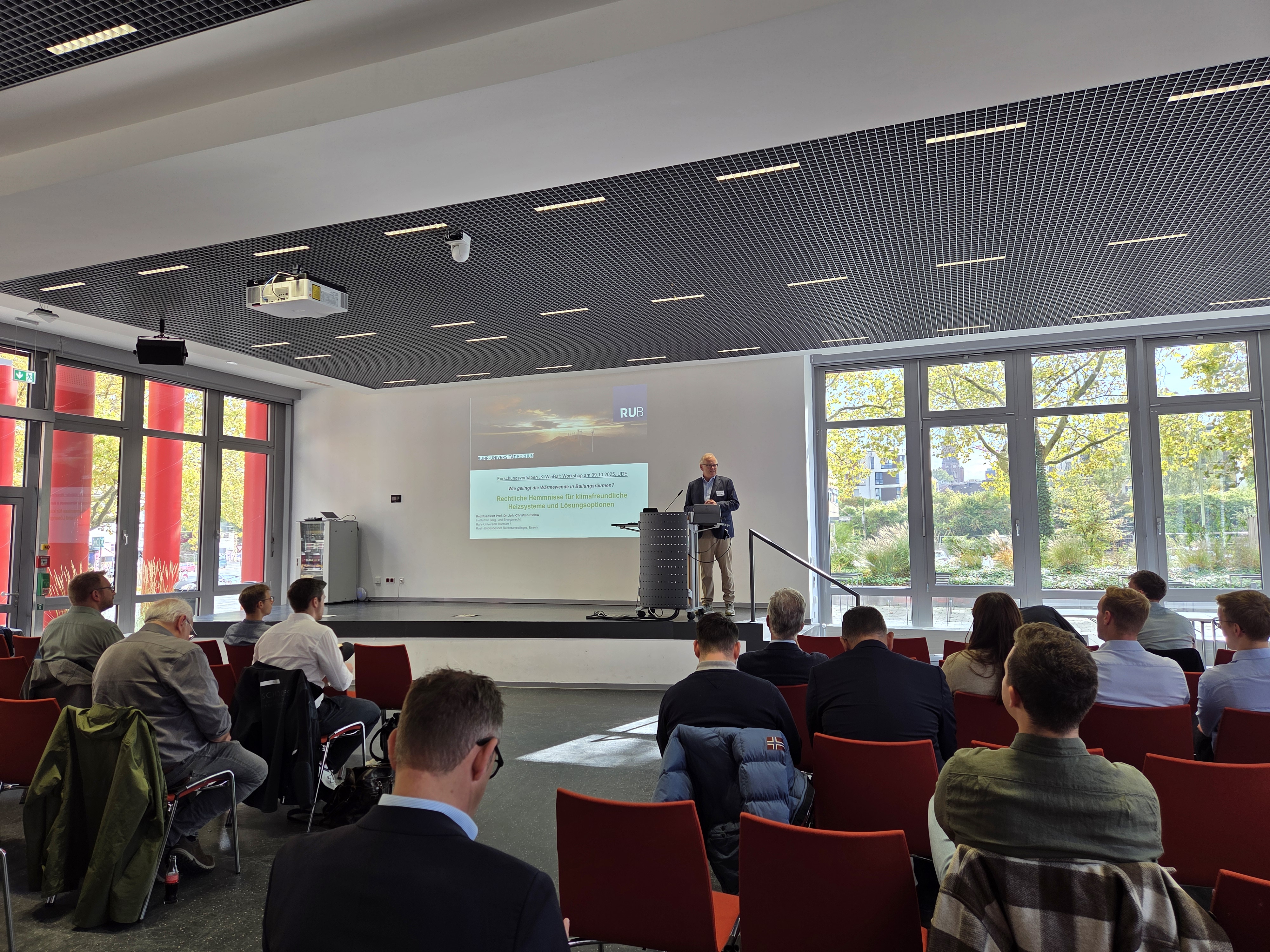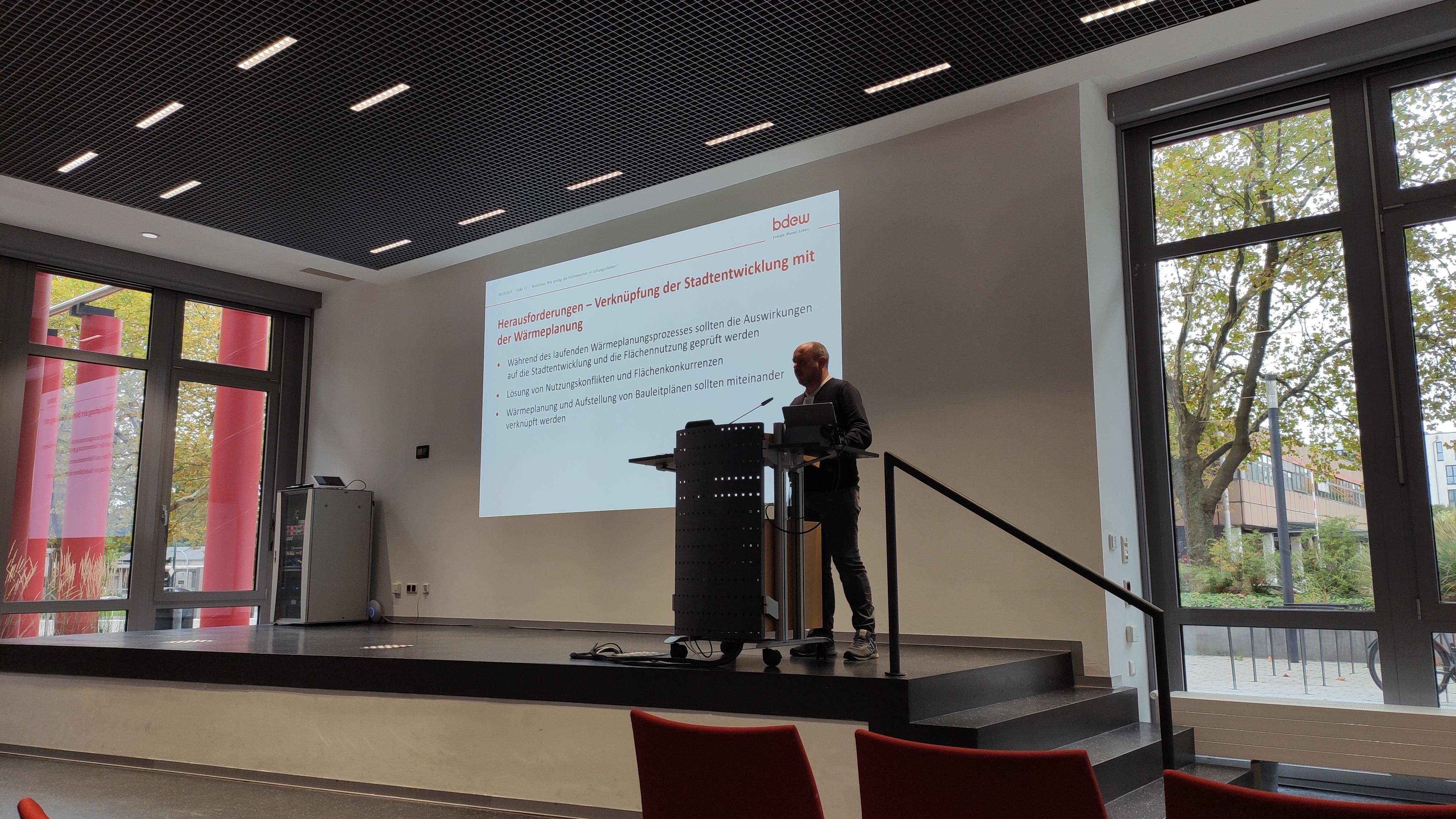 Am Nachmittag ging es weiter mit zwei Vorträgen zu rechtlichen Hemmnissen (Prof. Dr. Christian Pielow) sowie aktuellen Erfahrungen aus der Konzeption GEG-konformer Wärmeerzeuger für Bestandsgebäude (Thorsten Coß, AVU Serviceplus GmbH). In einer anschließenden Breakout-Session diskutierten die Teilnehmer:innen über praktische, regulatorische und ökonomische Herausforderungen. Dabei wurden insbesondere Themen aufgegriffen, die in den vorangegangenen Vorträgen noch keinen Platz gefunden hatten – etwa die teilweise zu komplexen und fehlgeleiteten Förderstrukturen, die mangelnde Zusammenarbeit zwischen Akteuren (z. B. bei Infrastrukturmaßnahmen, wenn Straßen ohnehin geöffnet werden, könnten gleichzeitig Fernwärme-, Glasfaser- oder Trinkwasserleitungen mitverlegt bzw. erneuert werden) sowie die im internationalen Vergleich hohen Strompreise, die den Ausbau von Wärmepumpen in Deutschland erschweren.