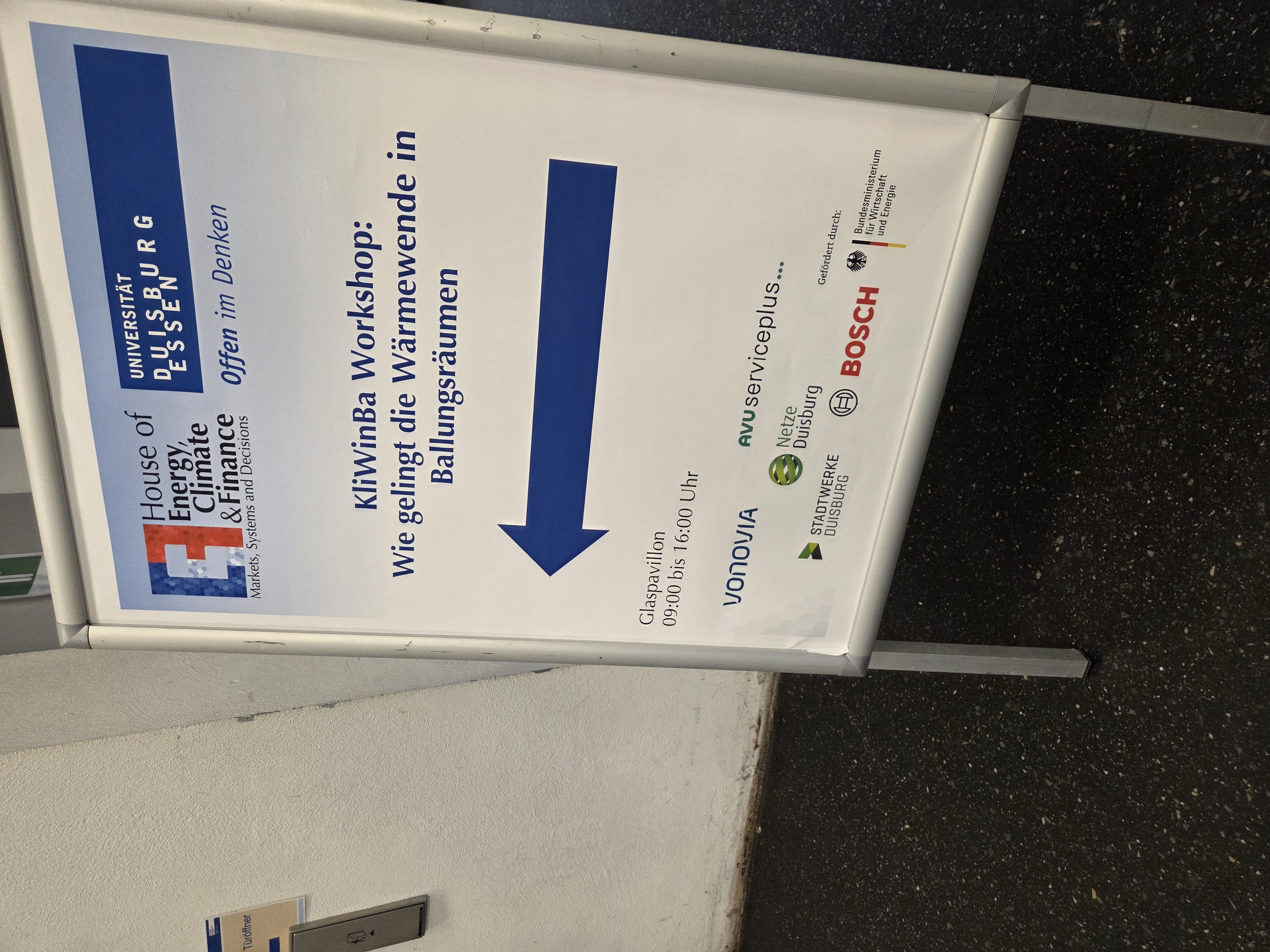 Im Rahmen des Projekts KliWinBa fand am Donnerstag, den 09. Oktober 2025 unser Workshop "Wie gelingt die Wärmewende in Ballungsräumen?" im Glaspavillon am Campus Essen statt! Ziel des Workshops war es, die Herausforderungen und Chancen der Wärmewende in städtischen Ballungsgebieten zu diskutieren und gemeinsam über Lösungen und Strategien für eine nachhaltige und effiziente Wärmewende nachzudenken.